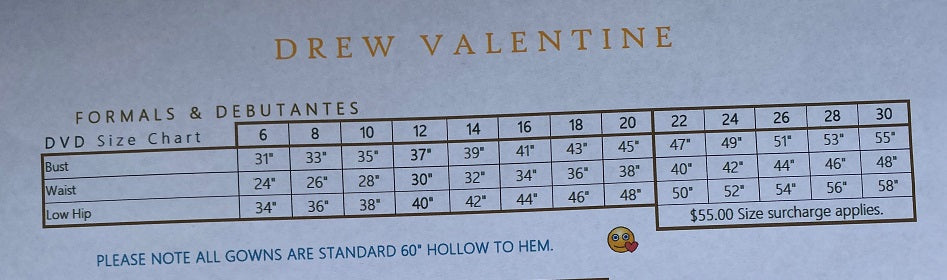 PLEASE NOTE: Pre-order dresses are made to our standard size charts, and may still require alterations when you receive it. We will often ask for your measurements during the ordering process, but this is only to ensure that you will fit into that standard size.