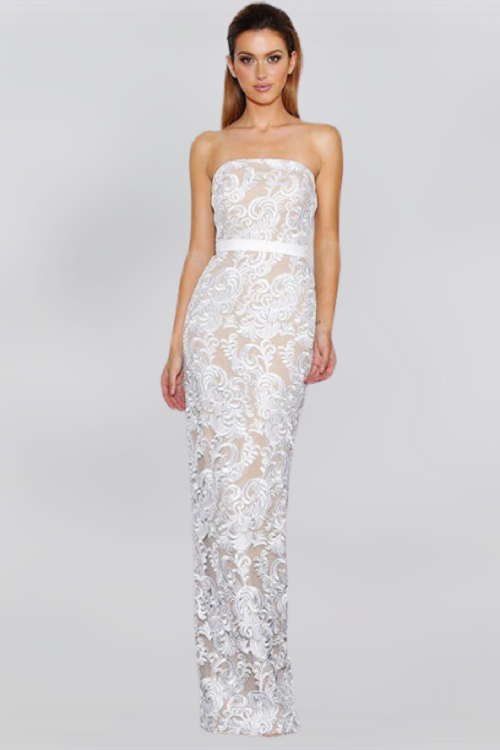 This elegant floor-length dress features a strapless neckline with belt detail and a split at the back.